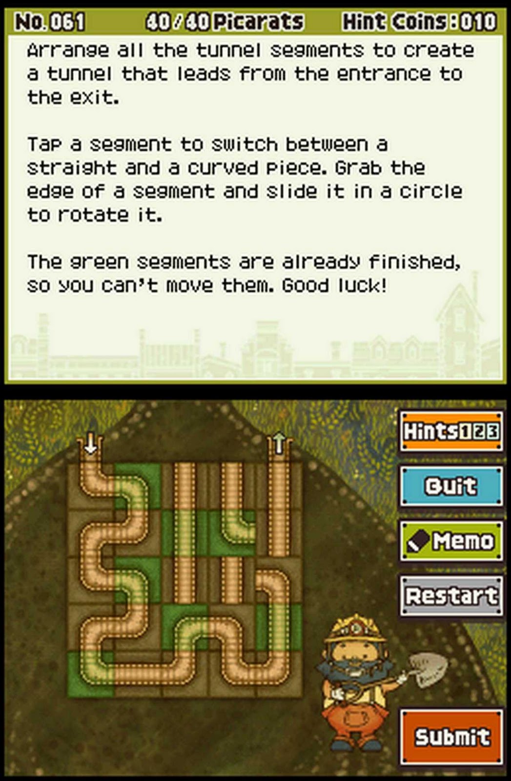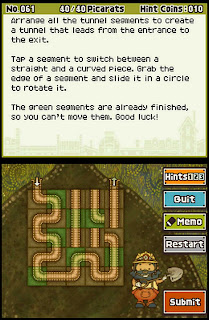 Finally, this brings me to the replayability factor. All puzzles that the player has solved go into the puzzle index so that the player can solve them again if s/he wishes. These are meant to be replayed so they no longer have a picarat value and all the hints are unlocked free of charge. The player can also categorize his/her favorites by marking the box next to them. These will be seen in the Picks tab. While knowing the answer does take away replayability, it's still worthwhile to replay certain kinds of puzzles such as the sliding block puzzles or the jigsaw-like puzzles. Now, after the game ends, there's still a lot to do. The picarats that the player has collected will unlock those juicy bonuses. In addition, the player can solve the bonus puzzles and after the player has solved every puzzle, s/he will unlock three more puzzles, which at the end will reward the player with a few little touches. All together, that's almost 170 puzzles and even after you solve every last puzzle, it's not over for the player can download weekly puzzles (which have already been put up) via Nintendo Wi-Fi. There are rumored to be around 52 weekly puzzles which means that there will be puzzle solving for a whole year. It's every puzzle nut's dream come true. Combined with the length and captivating story, this game will be in many a gamer's collection for a long time.