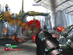 One thing you'll notice right off the bat is that the game is not really ‘serious' in anyway, as a matter fact it quite comical as its all supposed to be a funny cartoon like shooting fable. So with that, you know some stuff is actually sort of cute. For instance, your not fighting the most horrid ugly space demons ever laid eyes on in fact its no more than big buggy like aliens and wired parasites as well as human things , like headless clowns, and pigmies and kamikaze zombies. The levels also look fun and bright as they are all fun and games, until the gallons of blood stain the happy environment. The small movies can Also have humor in them but it's somewhat dry, like Sam diving into a water cave and having aliens hold up score cards, (not funny, but clever).