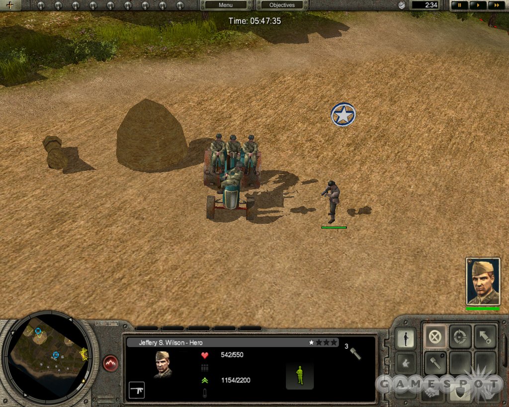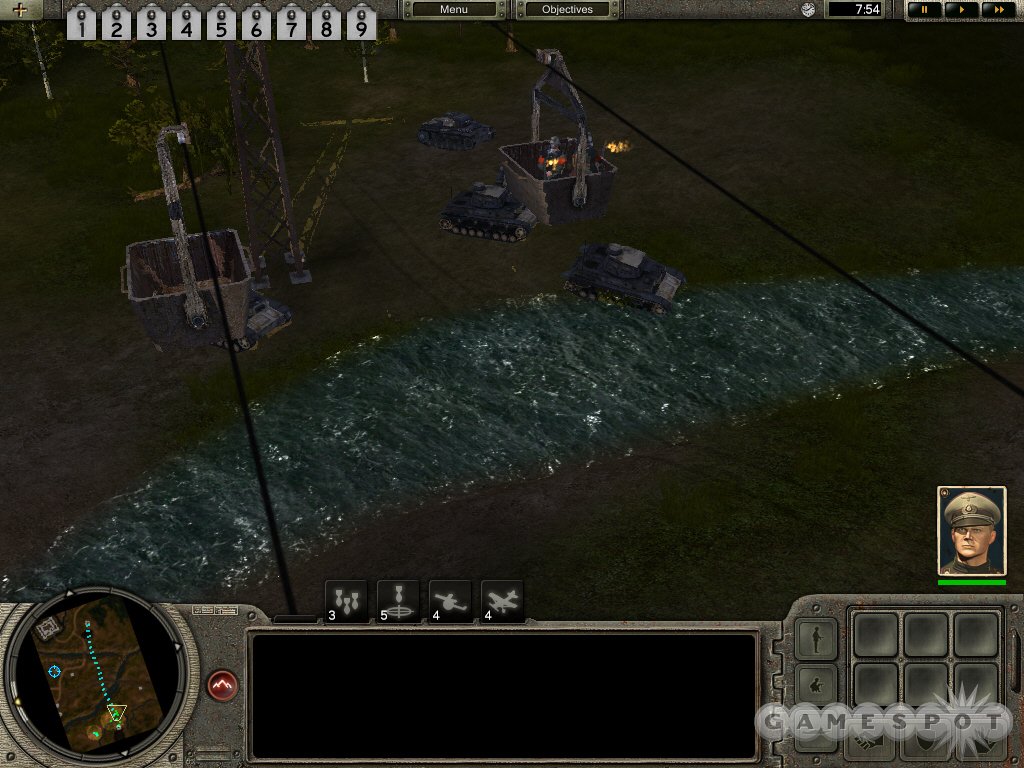 Game play is pretty standard RTS fare. Click on a unit to highlight it and then click where you want it to move to or attack. An icon menu appears at the bottom of the screen with any special functions this unit can perform, but most are not needed on a routine basis. Hot Keys are also available. Units can be formed into groups for ease of control. You can set each unit's stance as aggressive, cautious or defensive. Air strikes and artillery are covered by the game system. Click the icon, click on the map where you want it to hit and shortly, your fire support will rain down. Medics, repair trucks and ammo trucks automatically fix any unit they are near, just move them close and the game system takes care of the rest. It is rather intuitive and makes for ease of play.