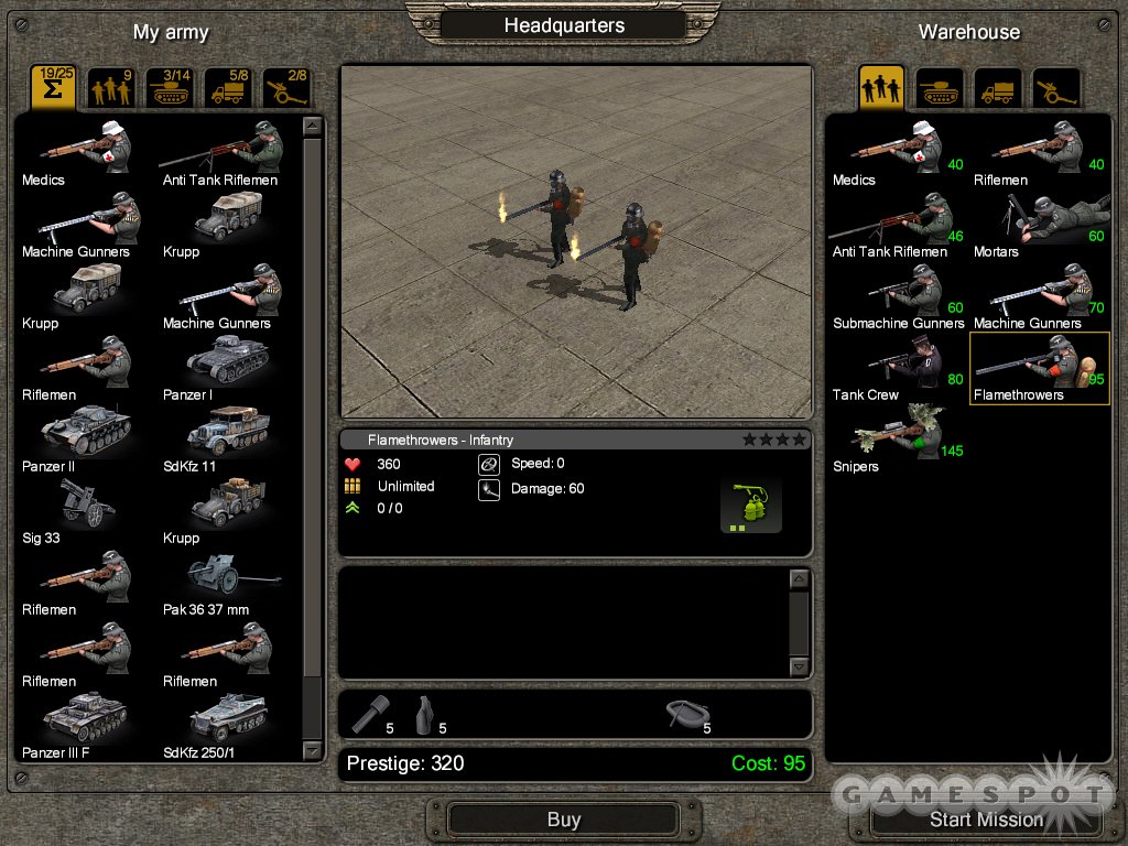 The overall premise is a tactical Real Time Strategy game with a hint of a Role Playing Game attached. You play as one of three named officers, a German, a Russian or an Anglo-American, in command of a core set of units. As you progress through the missions, your units gain experience as they fight and you gain prestige points. Hidden objectives can be found to increase your prestige points and give you in-game bonuses. Between missions, you can use your points to buy new units to add to your core, selling older units or upgrading them. It mostly works. If one of your core units is destroyed, it will be replaced, but it will lose all of its gained experience. If you are killed, of course, you lose.